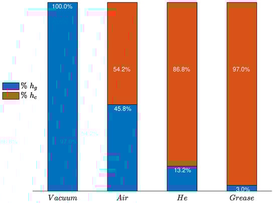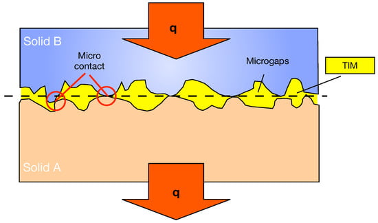 In the expressions above, it is assumed that the heat flows from one body to another only by means of conduction through the microcontacts (i.e., no interstitial conditions are considered) and no thermal interface material (TIM) is considered. Thus, to take into account both phenomena, the voids are filled with a TIM. The heat goes from one solid to the other by means of conduction through the microcontacts and throughout the microgaps (see Figure 4). According to [4,13,37,39], the gap conductance is modeled as: