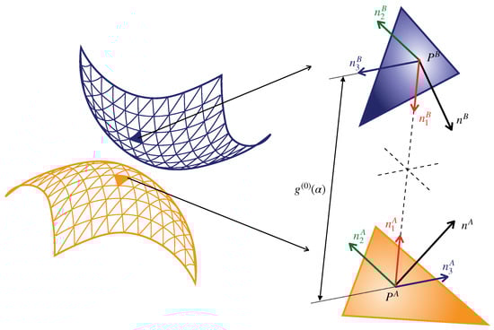 Under small displacement assumption, a common normal unit normal vector is considered on , as it is shown in Figure 5. Therefore, the nonlinear boundary conditions on the contact zone are: