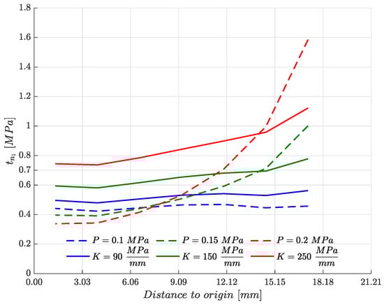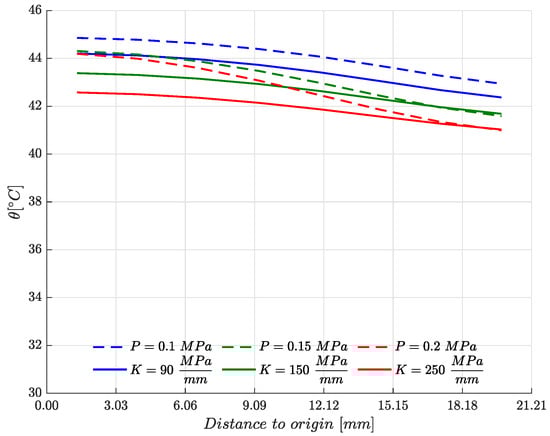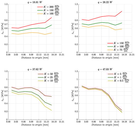 On the one hand, the clamping pressure is not kept uniform on the top face of the heatsink so the retention mechanism of the assembly is simulated by means of Winkler elastic support with a certain stiffness. Thus, a variable traction distribution is going to be produced depending on the deformation of the upper face of the heatsink. In order to perform the study, the different stiffness values of the Winkler elastic support were obtained from the average clamping pressures applied in each case (see Table 2). The results are going to be plotted and compered with the configuration shown in Figure 6a, where equivalent uniform clamping pressures are obtained.