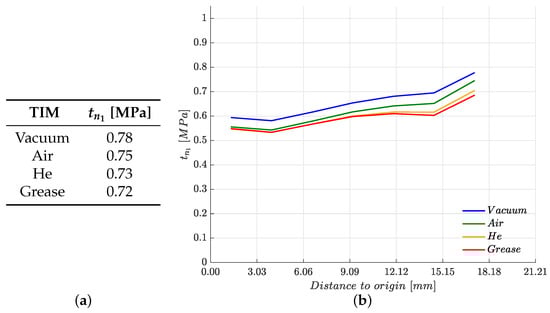 On the other hand, the heatsink is supported on its boundary (see Figure 6a) in such a way as to limit the vertical movements of the heatsink edges in order to obtain a more uniform traction distribution in the contact area. This normal traction distribution is going to reduce the average thermal contact resistance in the contact zone, which is going to lead to an improvement in the heat dissipation.