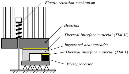 When the heat generation in the CPU microelectronic packaging is low (<20 W), the most commonly used packaging architecture is the one shown in Figure 1 where the heatsink simply rests on the microprocessor. This situation was modeled in [1], in which the behavior of the complete heatsink–microprocessor assembly was simulated, obtaining the normal traction distribution in the contact zone and the maximum temperatures on the microprocessor. Ref. [1] concluded that above certain constant clamping pressure in the top face of the heatsink, due to the fact that the heatsink is larger than the microprocessor, very high normal contact tractions appeared at the edges of the microprocessor due to a cantilever effect. In addition, this effect is accompanied by a decrease of the normal tractions at the center which could lead to detachments at this area. Moreover, the increment of heat coming from the CPU increased these effects due to the higher thermal deformations. Thus, the microelectronic packaging architecture shown in Figure 1 was limited to low heat generation.
