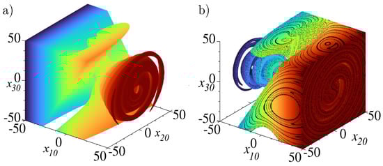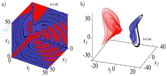 (a) Intersections of the basins of attraction of Equation (2) with the planes , and . For the parameter value , the system presents three stable chaotic attractors, depicted in (b).
