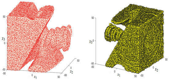 Most previous studies on basins are focused on cross-sections in , while there is also a example of a basin plot such as in [27] for the tristability of the Lorenz system, but we obtained results for multistability using FORTRAN and MATLAB in continuous and discrete points, which can be seen in Figure 4 and Figure 5, respectively. Both results in Figure 4 and Figure 5 look similar; the difference is that the results achieved using FORTRAN with eight processors are informative and good-looking from a reader’s end. However, the results obtained with the aid of MATLAB were using four processors and were represented in a discrete way, which can provide more information for the readers by zooming on it.