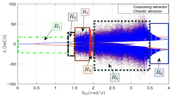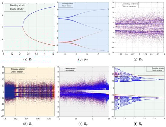 In Section 2, we saw that some trajectories were approaching towards another region and stayed there, which indicated the existence of another attractor in the system (2). In this section, the analysis of system (2) was performed using famous tools such as a bifurcation diagrams, Lyapunov exponents and the Poincaré section, using the Runge–Kutta algorithm. Moreover, for each simulation in this paper, the time step was . In Figure 6, the bifurcation diagrams of coexisting (red color) and chaotic attractors (blue) were plotted for a damping coefficient in the range . In order to perform a deeper analysis of the bifurcations, we divided Figure 6 into six subregions, –, and each region is enclosed in various colored rectangles.