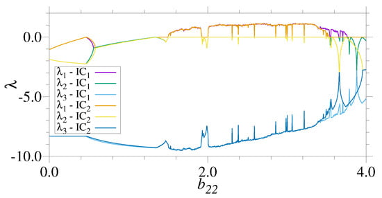 In Figure 8, the Lyapunov exponents diagram with respect to the bifurcation parameter were plotted. The exponents were calculated according to the algorithm proposed by Wolf [45] considering the same initial condition for each value of , so although it was useful to investigate the presence of chaos, this diagram was not able to indicate the presence of effects such as bi- or tristability.
