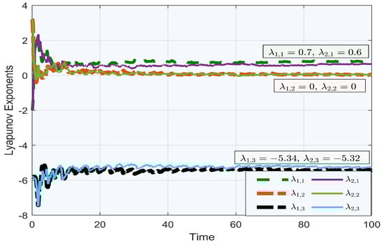 Lyapunov exponents can be achieved for each value of the bifurcation parameter as shown in Figure 8, but one can also verify the Lyapunov exponents for single values. In Figure 9, there are six Lyapunov exponents where (, , ) = (, ) represent the chaotic attractor belonging to the first basin, whereas (, , ) = (, ) represent the coexisting attractor belonging to the second basin. Chlouverakis and Sprot in 2005 modified the Kaplan–Yorke dimension [46] and reported that belonged to interval for any dynamical system showing the existence of chaos. Hence, in both our cases,