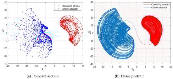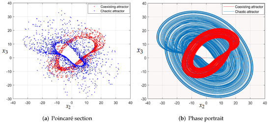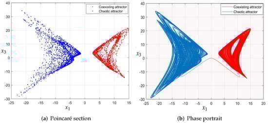 For convenience, we have plotted the coexisting attractor along with the chaotic attractor. In Figure 10, two subfigures in the x–y plane can be observed, in which Figure 10a illustrates the Poincaré section of both attractors and indicates an unlimited number of points after passing though the x–y plane. All these points illustrate the existence of chaos, whereas Figure 10b shows the phase portraits of both attractors. Moreover, the attractor given in blue color belongs to the first basin, while the attractor with red color is in the second basin.