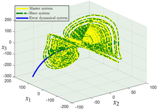 Figure 13 is a phase portrait of system (8) following the path of system (2) in which trajectories are observed in three different colors. The trajectory in yellow color represents Equation (2) and is considered as the master system. The green colored trajectory shows the slave system and the blue color illustrates the error between master and slave systems. As the estimated parameters start approaching their original values, using the parameter updated law (17), the error terms , , tend to zero which indicate the slave system in green color will converge towards the master system as time advances.