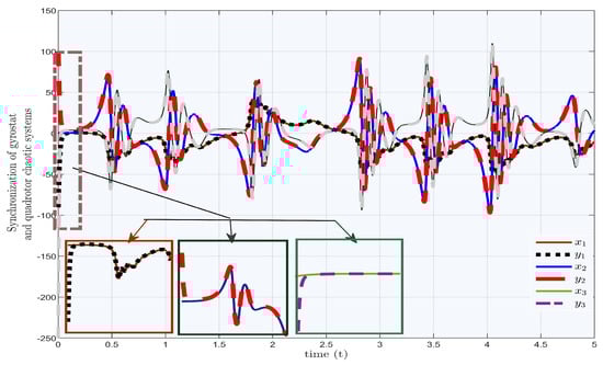 Mathematically, the results given in Theorem 1 with the controller ensure that the trajectory of the QUAV system synchronizes with the gyrostat chaotic system. However, numerical simulations were conducted to validate the analytical work given in Equations (11)–(19).