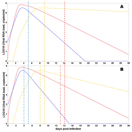 As follows from the simulation results, the concentration of viral particles in 1 mL of the nasopharyngeal fluid reaches 5.5 Log10 viral particles per 1 mL (Figure 4 and Figure 5). In general, this does not contradict the published data. The SARS-CoV-2 virus was detected in saliva at concentrations of 104–108 RNA copies per 1 mL of saliva [36], while the average saliva production in an adult is 1–1.5 liters per day [7,18].