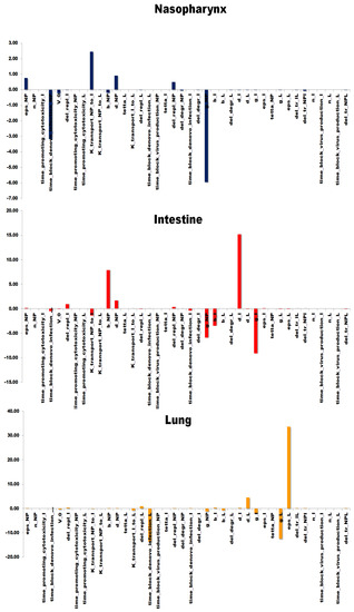 The fraction of target cells that remain uninfected in the intestine, in turn, is the most sensitive to the death rate of infected cells (and viral particles in these intestine cells, respectively), . It indicates that renewal processes of the intestinal mucosa may play an essential role in the infection dynamics in the intestine. The interesting aspect of the analysis for the compartment is the sensitivity of the intestinal fraction to the SARS-CoV-2 life cycle in the nasopharynx (infection and replication rate constants, and , as well as the death rate, . The result also confirms the potential benefit of an infection control strategy via the gate of infection, the nasopharynx. Eventually, the fraction of uninfected lung cells is also sensitive to the virus replication in the compartment, L, but the variable in the lung is mostly sensitive to the effectiveness of the humoral response, ϵL, blocking de novo infection, and the timeframe of the response, . Thus, the infection dynamics in the lung is mainly determined by the humoral immune response and its onset, proposing the treatment way in combating SARS-CoV-2 in human lungs.