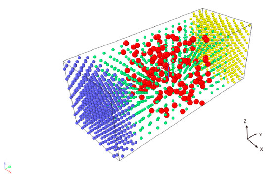 In 1993, Steve Plimpton created a large-scale atomic/molecular massively parallel simulator (LAMMPS) [55]. This open-source software LAMMPS was used for the simulations of the DMP model. Many researchers have enhanced and expanded LAMMPS since its initial release, incorporating mesh-free computational methods such as DEM and SPH, as well as others [42,56]. LAMMPS is a molecular dynamics (MD) algorithm that simulates groups of particles in solids, liquids and gases. Using different boundary conditions and inter-particle potentials, it can simulate microscopic, mesoscopic or macroscopic systems. Generally, LAMMPS solves Newton’s motion equations about a group of interaction particles. To meet certain research needs, custom features in the LAMMPS source code can be implemented by using LAMMPS input script commands. Then information, such as the position and velocity of the particles, is outputted. However, LAMMPS could not carry out in-depth analysis of the simulation and could not visualize and plot our output data; however, this could be performed by Ovito software [57]. This powerful software played an important role in obtaining scientific insights from the data. Without the appropriate visualization and analysis software package, key information would have stayed unknown and unavailable.