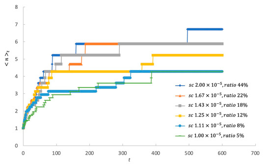 The evolution of average aggregate size with different fluid resolutions (initial distance between fluid particles, sc; the ratio between the number of solid and liquid particles). The average number of particles per aggregate and time t along axes were both dimensionless. The unit of t in the x axis is the number of frames for visualization using Ovito software. Here, 600 frames at the end of simulation corresponded to 60 s.