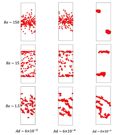Steady−state structures of solid particle aggregates in the x−y plane side view (length along x and y directions: W (75 mm) × H (200 mm)) at a solid particle volume fraction of 4.2% for different Reynolds numbers and adhesion numbers.