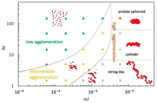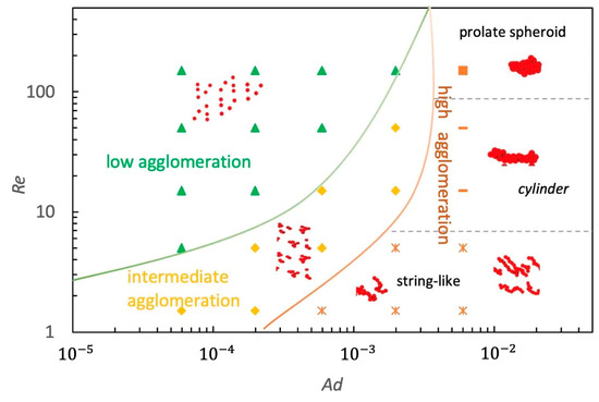 Figure 5 also presents three agglomeration regimes, i.e., low, intermediate and high agglomeration. The major difference between Figure 4 and Figure 5 is in the low-Re region of the high agglomeration area. While at α = 4.2% a single long string formed, at α = 2.4% there several shorter strings. Due to the lower density, there were fewer particles for agglomeration and the shorter strings did not merge into a single chain.