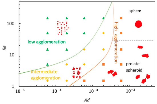 Up to this point, the results presented have been based on the JKR adhesion model (Equation (10)). In this section, the simulations were performed with the DMT model (Equation (9)) for comparison. Figure 6 shows the agglomeration regimes obtained with the DMT model at α = 4.2%. In general, it shows a similar map to the JKR model. In the high agglomeration area, the JKR model tended to generate branched aggregates or particle chains while the DMT model predicted relatively regular (more compact with fewer or no branches at all) small aggregates. This was due to two factors. The first was that the JKR theory uses a smaller pull-off force, 3πgR (compared to 4πgR in DMT theory). The second was that the JKR theory hypothesizes that particles do not move apart immediately, but stretch while keeping adhesion, until a tensile force reaches up to 3πgR, at which point particles separate. The stretch prolonged the adhesion duration, enabling particles to re-aggregate as a result of collisions with other adjacent particles. This indicated that the adhesion models had an important effect on the shape of the aggregate structures. Different types of physical agglomeration (e.g., polymer flocculation, coagulation, hydrophobic attraction) complied with different adhesion models. Although only two popular adhesion models were studied, the methodology presented in this paper could be easily extended to other adhesion models provided that a functional form for the inter-particle forces Fi,j is known.