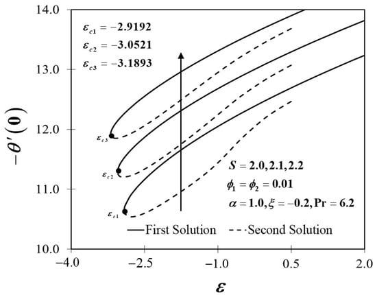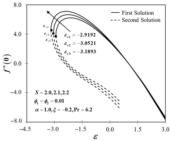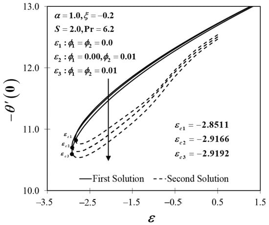 The bvp4c scheme in the MATLAB package is utilised to solve the coupled Equations (10) and (11) with boundary conditions (12) numerically (see Shampine et al. []). The accuracy of the results was confirmed by comparing them to the previously reported data in Table 3 and Table 4. However, the numerical method developed in this paper might fail to provide meaningful results in certain cases. For example, in general, the governing equations in the present work are solved using the similarity transformation. Therefore, all resulting parameters in this study must be constant, including the nanoparticles volume fraction , suction parameter , unsteadiness parameter , and the stagnation flow strength . If the governing parameter is dependable, it fails to admit the similarity equation, producing unreliable results. Another way to determine the accurateness of the numerical method used in this study is by observing the generated profiles. If the profiles are not asymptotically converged, it is thus not satisfying the boundary condition (12). Therefore, we can conclude that the results were indeed insignificant.