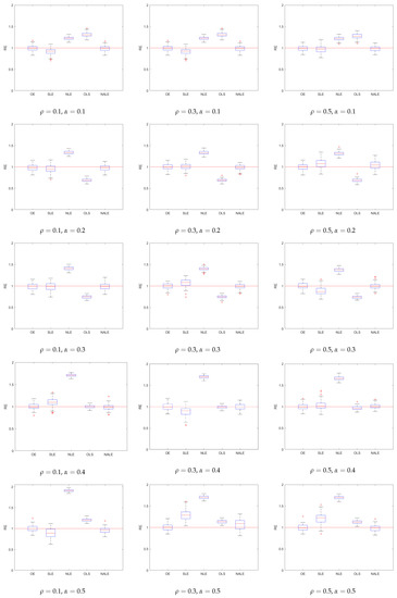 For the SLE, we consider three penalty levels , , which is similar to Example 1 in [17]. Then, the best estimator is selected as the final SLE estimator. Indeed, Ref. [17] found that works very well for SLE. By the simulation results of [13], the OLE with and performed very well, where . From [20,24], the tuning parameter used in RBE is calculated by setting with .