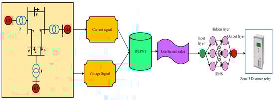 The WSCC IEEE 9 bus system contains three generators and three loads. The transmission line’s voltage and current are sensed to create a dataset. The sensed value is given as an input of IMDWT. IMDWT is a component that splits a signal or data into a different frequency. It values the input signal in Fourier transform to handle the sudden variation of signals competently. IMDWT has many useful power swing/faults transient features. Taking a wavelet wave, for example, to make the same original transients shape, IMDWT tries to balance them down and up, and moves left and right. It gives an appropriate coefficient of the input signal as well as the value that is most useful for analyzing transients in a fault condition. The coefficient values are given as an input of an improved deep neural network (IDNN) classifier. An IDNN is a kind of data-driven machine learning technique and is modeled to maintain the logic of the proposed method. By using an IDNN, the system’s robustness and stability are improved. An IDNN acts in two modes of operation, namely blocking mode (RDL-1) and fault/power swing detection mode (RDL-2). During the blocking mode, the coefficient value is analyzed by RDL-1 to produce a command signal of the relay. During the fault detection mode, RDL-2 analyzes the coefficient value and generates a command signal to the third zone distance relay. The threshold-based method is used to reduce the error as well as improve the working performance of the IDNN. Numerical modeling of proposed components is provided below.