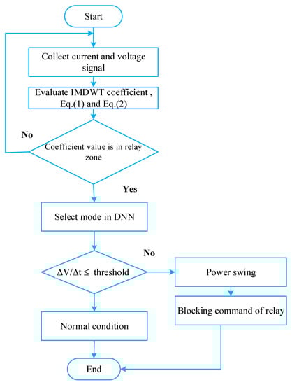 The supervision-based blocking system works on the basis of recognition of power swing/faults in the system. The operation of the third zone distance relay is on the base of the IMDWT coefficient value. A power swing is identified by measuring the current and voltage of the transmission line, its corresponding coefficient, and the classifier. An in-depth description of IMDWT and IDNN is presented below section.