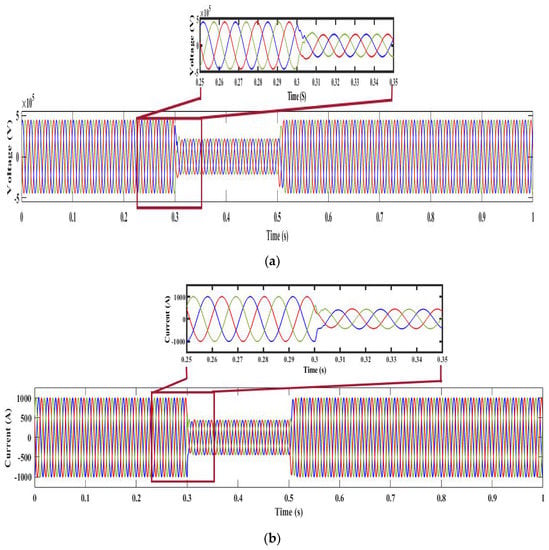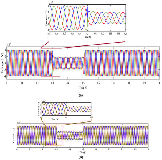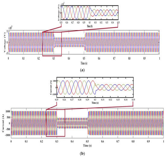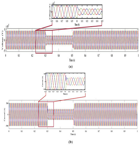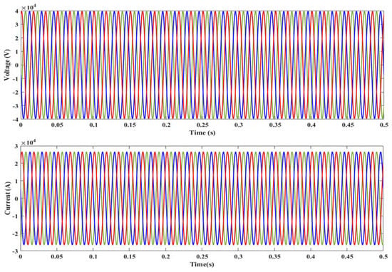 Under normal conditions, the flow of voltage and current is not varied because the load is not much varied. Therefore, the system does not face a power swing/fault condition. Figure 5 shows the waveform of voltage and current under normal conditions at Bus 2. It shows that the voltage of the system flows from −40 kV to +40 kV. Similarly, the current varies from −26 kA to +26 kA.