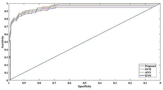 The ROC and AUC of the proposed method are illustrated in Figure 10. The ROC curve is a performance measure for classifying tasks at different levels of the threshold. The ROC is a probability curve, while AUC stands for separable size or quantity. This shows how different the model is amongst classes. The AUC forecasts that class 0 will be 0 and class 1 will be 1. The AUC indicates the appropriate class prediction of the proposed method. If the AUC is high, the proposed model predicts 0 classes such as 0 and 1 classes as 1. The proposed technique obtained the best fault detection validated by performance matrices based on the ROC characteristics. The proposed SBS is used to examine the blocking scheme utilizing the impedance approach based on the fault detection phase.