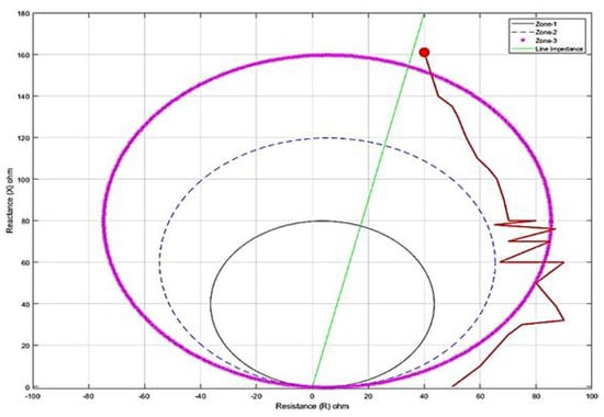 Zone 3 distance relay is used for measuring mho units in conjunction to detect the power swing. In the proposed work, a powerful swing is formed at the second generator owing to the variation of loads. Figure 11 shows the distance relay characteristics under power swing conditions. The figure shows power swing passes to the third zone, which is analyzed, and the distance relay is blocked to secure the system.