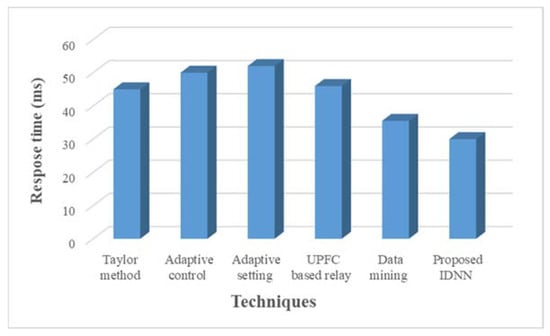Figure 13 shows the response time of the relay in the proposed and existing methods. Taylor method-based fault detection [] takes 45 ms to generate a command signal of the relay. An adaptive method-based fault detection [] takes 50 ms to generate a command signal of the relay. The adaptive setting-based fault identification [] method takes 52 ms for command generation. The UPFC based relay approach [] takes 46 ms to generate a command signal. The data mining technique [] takes 35.5 ms to generate a command signal of a distance relay to block/unblock the relay. The proposed improved DNN takes only 30 ms to analyze the voltage and current and generate a command signal of the relay to block/unblock the relay. The comparison figure shows that the proposed method more effectively identifies the power swing/fault as well as block/unblocks the relay within a rapid period.