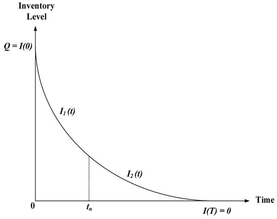 Next, by following Equation (4), the inventory level for deteriorating items is denoted by , and at , the level of inventory vanishes. However, the deterioration rate is measured to be a constant and is given by . Thus, the inventory variances for this period are described as