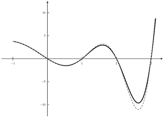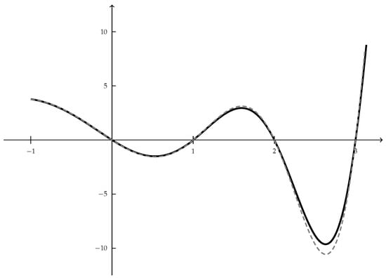 The gray-color curve represents the function in the left hand side in (54) for , and the black curve is the limiting function. Data: , , and .