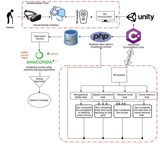 Based on computer aided diagnosis (CAD) tools, the current study combined a model for VR system-based cognitive tasks, and machine learning algorithms were proposed as the Medical Visuospatial Dementia Test (MVD Test). The developed model contains multiple cognitive methods to assess the impairment of the cognitive abilities of patients and uses classification tools. The performance of participants is compared with an individual’s diagnosis based on traditional neuropsychological tests used for the same cognitive domains: (i) older adults who have normal cognition; (ii) MCI; and (iii) early and moderately severe dementia. It was designed for all people in the world, including both educated and non-educated. The system was tested on 115 real patients from King Abdul-Aziz Hospital Dr. Soliman Fakeeh Hospital, Association of Elderly People Friends, and International Medical Centre. Thirty of these individuals had a cognitive impairment, sixty-five were cognitively healthy, and twenty had a mild cognitive impairment. The age of all patients was higher than 50 years, and patients were selected from both educated and non-educated backgrounds. The nature of the collected data was discrete, non-parametric, non-normalized, and labeled. Consequently, supervised and classification algorithms were used to classify the patients. The data were used as an input for the MLAs that perform a classification at the output end. In addition, for the MLAs, a series of statistical indicators were computed: accuracy, sensitivity, precision, and specificity. In the subsections that follow, we discuss the architecture model used to classify dementia patients, as shown in Figure 1.