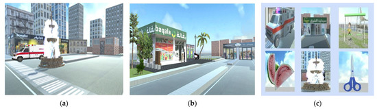 Firstly, the patient listens to the instructions of the system. Then, to prepare him/her for the examination, the patient is given a tour around the environment. The objective is for the patient to hold the most recognizable scenes in their memory. The environment consists of a sea-view lane, some shops, and a supermarket. Four of the cognitive tasks are carried out by the patient; each test provides cognitive scores. The information is compiled, and sensitivity and precision are then extracted from the system. This information is used by the machine to diagnose the patient’s cognitive disability. Each test involves tasks in a particular scenario in which cognitive testing is carried out (Figure 1).