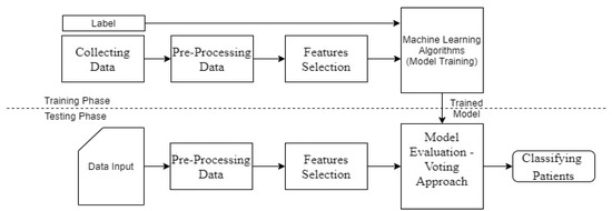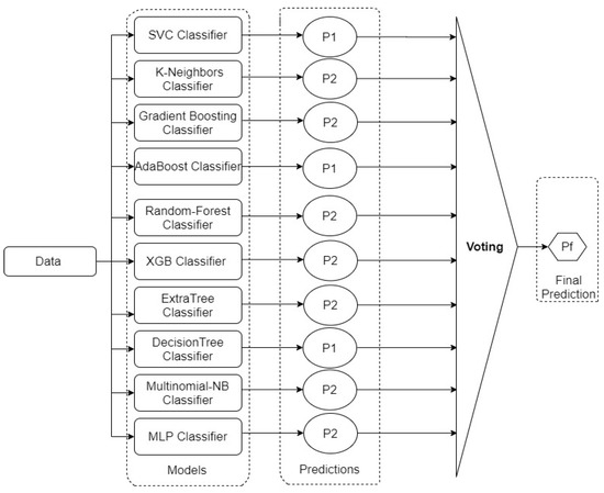 By constructing a model based on one or more numerical and/or categorical variables, classification is the task of defining and sorting items from certain classes into their appropriate categories (predictors or attributes). The purpose of classification is to be predictable in order to ensure all data is reliable and accurate [28]. The main idea of classification is to build by selecting the objects in certain classes and assigning them to their appropriate categories, predictors, or attributes [19]. This study focused on classification methods in which classifying patients depends on multiple algorithms, i.e., Decision Tree [29], Extra Trees [30], AdaBoost [31], XGB [32], Gradient Boosting [33], SVC [34], Random Forest [35], Multinomial NB [36,37], K-Neighbors [38], and MLP [39]. These algorithms are used for disease diagnosis as they achieve good accuracy. Then, a voting approach, namely Ensemble Vote [40], is used to vote for the most frequently used approaches from the latter MLAs. The next paragraphs discuss the classification methods that were applied in this study.
