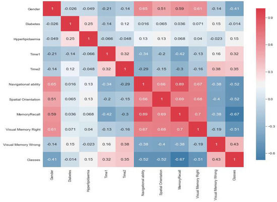 The MVD system extracts the most important attributes depending on a heatmap, which assigns values between −1 and 1. Then, features are used as inputs for the classifier (see Figure 4). For example, Memory Recall-VaR System and Navigational ability appear to have a strong correlation (0.90) with each other.