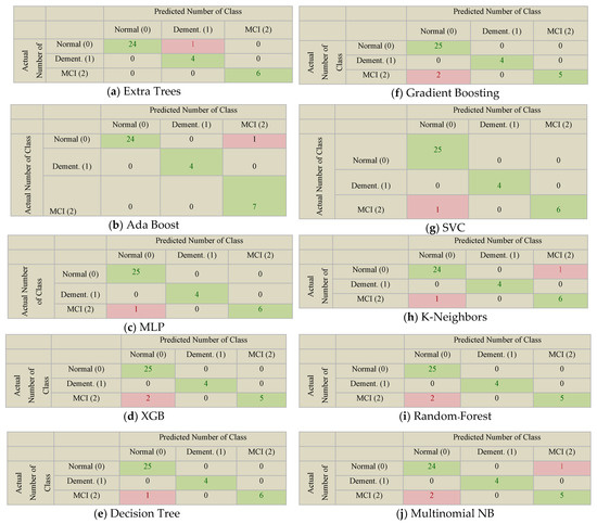 Confusion Matrix for multi-categorical classification models: (a) Extra Trees, (b) AdaBoost, (c) MLP=Multilayer Perceptron, (d) XGB = X-Gradient Boosting, (e) DT = Decision Tree; (f) GB = Gradient Boosting, (g) SVC = Support Vector Classifier, (h) K-N = K-Neighbors, (i) RF = Random Forest, (j) MNB = Multinomial Naive Bayes. Note: Correct class with green box, wrong class with red box.