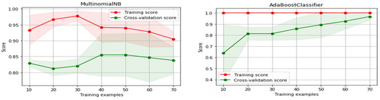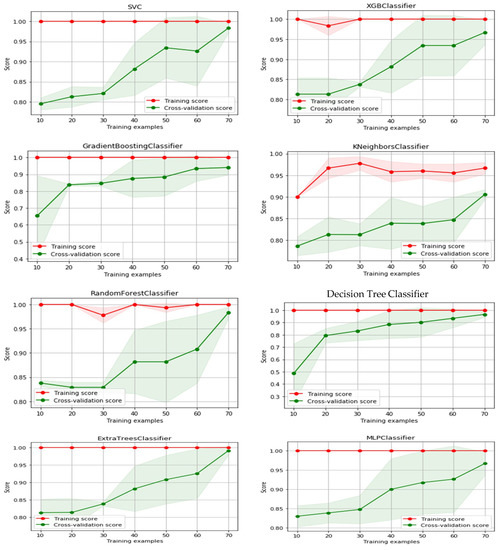 Evaluation metrics such as sensitivity, specificity, accuracy, F1, precision, Mean Squared Error (MSE), the ROC curve, micro-average, and macro-average were used to determine the performance of the ML models. The different MLAs that were used to measure the classification of patients included: Extra Trees, SVC, AdaBoost, K-Neighbors, XGB, Decision Tree, MLP, Multinomial NB, and Random Forest. In the next subsections, the training and testing phases are explained, and the performance results of the MLAs and the learning curve are discussed in detail. Then, the results are generalized by the voting approach, namely Ensemble Vote [40]. Visualization data are explained in the final two subsections.