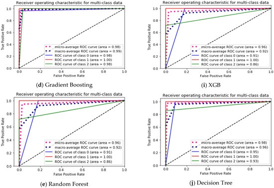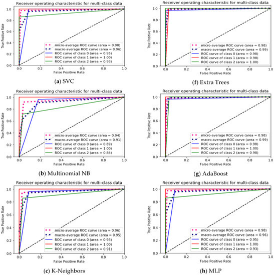 As a conclusion, all evaluation metrics used to determine the performance of the ML models revealed that there were high levels of classification accuracy, sensitivity, specificity, precision, F1, ROC curve, micro-avg, and macro-avg. Furthermore, the ranking of the highest performance rates assessed from the SVC, MLP, AdaBoost, Extra Trees, Gradient Boosting, and Decision Tree models showed that there was no distinction between them.
