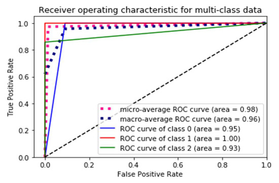 Table 5 shows the performance results based on the voting approach using the hard vote method and where all different classifiers have equal weight. The accuracy of classification is 97.22%, and the sensitivity of dementia patients and cognitively healthy patients is 100%, whereas the sensitivity of MCI patients is 86%. Specificity and precision of dementia patients and MCI patients are 100%. As shown in Figure 9, the micro-avg ROC curve and the macro-avg ROC curve are close to 1. Furthermore, the ROC curve for all classes shows high values between 0.93 and 1.00.