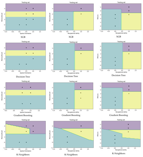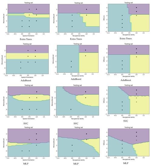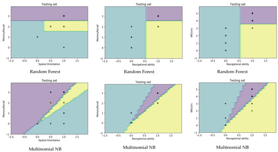 Figure 10 reveals the decision boundaries of classifiers with spatial orientation on the x-axis and memory recall on the y-axis as 2D features, where all models show higher discrimination between the dementia class and other classes. Furthermore, some of the data-points that were considered for the MCI class were overlapped with those of other classes, such as MLP, Multinomial NB, and XGB. Figure 9 also shows the decision boundaries of classifiers with navigational ability on the x-axis and memory recall on the y-axis as 2D features, where all models except the MLP classifier show perfect discrimination in all classes, i.e., each data-point predicted is in the right region. Similarly, the latter figure reveals the decision boundaries of classifiers with navigational ability on the x-axis and VR scores on the y-axis as 2D features, where all models except the MLP classifier show perfect discrimination in all classes, i.e., each data-point predicted is in the correct region. The above results reveal that memory recall, navigational ability, and VR scores are very important features when there is reduction to two features.