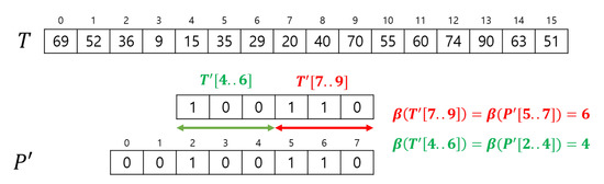 Various algorithms for solving the OPPM problem have been proposed. An algorithm proposed in [1,2] solves the OPPM problem in time using the failure function of the Knuth–Morris–Pratt (KMP) algorithm [3]. An algorithm proposed in [4] solves the problem in time using fingerprints for q-grams that consist of q consecutive characters based on the factorial number system [5,6]. An algorithm presented in [7] is executed in sublinear time on average using binary encoding. An algorithm proposed in [8] uses a skip-search approach [9] and the Intel streaming SIMD extensions (SSE) instruction sets [10]. An algorithm using packed string matching [11,12], the SSE, and advanced vector extensions (AVX) instruction sets [13,14] was proposed in [15]. OPPM in a tree and a directed acyclic graph instead of a simple string were investigated in [16]. In [17], the OPPM problem was solved using a filtering method with minimum (or maximum) values. By generating order-preserving suffix trees in time, an algorithm presented in [18] searches P in time, where is the number of substrings of T that are order isomorphic to P.
