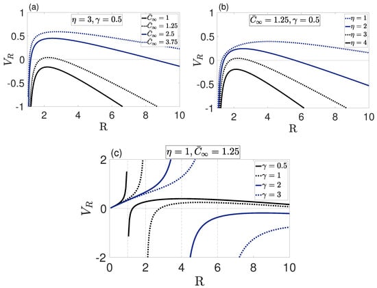Tumor growth rate, , vs. R for various values of nutrient supply in (a), nutrient consumption in (b) and surface tension in (c). A maximum of two plausible steady-state solutions existed, which could be stable () or unstable (). It could be seen that the maximum of two steady-state solutions was achieved for sufficient nutrient supply (a), low consumption rate (b) and low surface tension (c).
