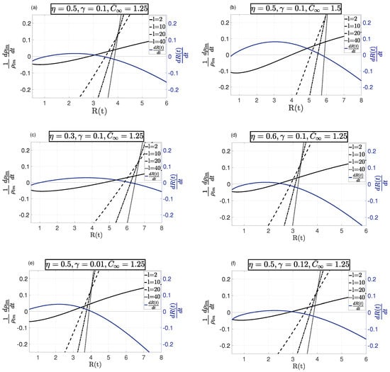 Equation (37) describes the growth of asymmetric modes in time, which depends on both system parameters and the system variable . These modes can be either excited or damped for various ranges of . In order to find these ranges, the evolution equation in (37) was plotted against for particular choices of system parameters in Figure 2. Each curve corresponded to a particular asymmetric mode number. The rate of growth was also plotted to indicate the steady-state radially symmetric solutions. As discussed in Section 2.1, there were at most two steady-state solutions, , depicted in the figure, identified by ; however, only was dimensionally stable. Therefore, we carried out asymmetric stability analysis only for .
