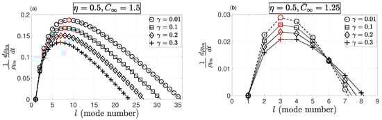 Growth rate of asymmetric modes with respect to l (mode number) for and . The mode number that maximized the asymmetric growth rate (maximal mode) is marked in red, indicating that increasing surface tension dropped the dominant mode from to for ; however, it had a fixed value of for .