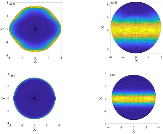 Figure 4 depicts the three-dimensional configurations of the tumor (39) and (40) after sufficient time when only the growing modes were observable. For the two choices of parameters used in Figure 2a,b, i.e., and , the corresponding unstable modes were and , respectively. Implementing these parameters and the unstable modes in (39), perturbed radii were obtained to plot the asymmetric configurations.