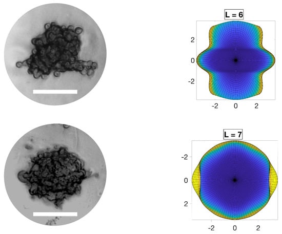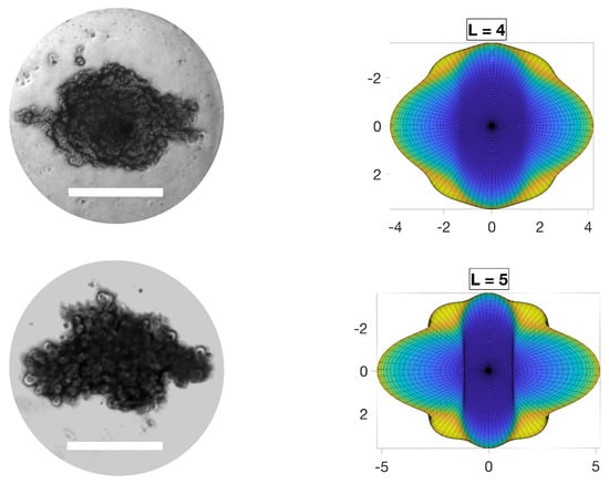 In this section, experimental results are compared to the model predictions presented in previous sections. To this end, the asymmetric modes were compared against the formation of in vitro solid tumor spheroids generated from a glioma cell line (U251 hGB cells). HGB cells were cultured in Dulbecco’s Modification of Eagle’s Medium (DMEM) supplemented with 10% (v/v) Fetal Bovine Serum (FBS) and 1% (v/v) Penicillin/Streptomycin and incubated at 37 °C in 5% CO2. Cells were then dissociated with GibcoTM Trypsin-EDTA (0.5%), centrifuged at 300× g (5 min) and counted using a Trypan blue assay. Self-filling micro-well arrays (SFMAs) were used to produce tumor spheroids []. Spheroids were then supplemented with fresh medium every 24 h to maintain the concentration of nutrients. To resemble the conditions considered in the analytical part as closely as possible, only approximately spherical tumor spheroids were selected, and only small spheriods of ∼200 μm diameter, to avoid heterogeneity in their cell population, such as hypoxic and necrotic cells. Presence of such heterogeneity violated the adopted assumption of linear nutrient consumption throughout the tumor, , constant, as hypoxic cells normally switch their metabolism to anaerobic glycolysis where they consume glucose at a higher rate compared to normal cells. We also provided them with a constant concentration of nutrients at their boundary by regularly refreshing the medium. Although the spheroids were kept in a symmetric medium, asymmetric stimuli are always a part of the natural environment of tumors. Images of tumors were obtained using optical microscopy (Axio Observer, ZEISS, Oberkochen, Germany). Figure 5 shows images of a few representative examples of aspherical tumors frequently observed in experiments, compared with model predictions of the maximal asymmetric modes. The qualitative comparison showed that the tumor spheroids acquired configurations similar to the model predictions. It should be noted that the experimental results were limited in terms of quantitative measurements due to the complexity in implementation of the parameters of interest. For instance, the real system could only start from an approximately spherical shape. In addition, the environment could not be perfectly uniform. However, reasonable agreement was observed between the experimental results and the model predictions where the salient features of the tumor configurations aligned with the model predictions of configurations dominated by the growth of asymmetric modes.