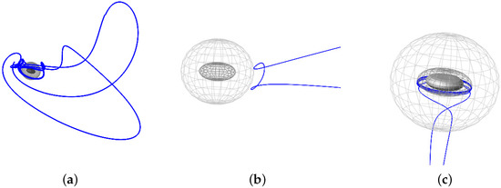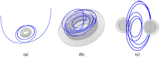Orbits of particles (blue curves) around the rotating dyonic black hole. The horizons are represented by grey ellipsoids and the dark grey structure is the singularity of the black hole. (a) Bound orbit; (b) Escape orbit; (c) Two-world escape orbit crossing both horizons twice and emerging into another universe.