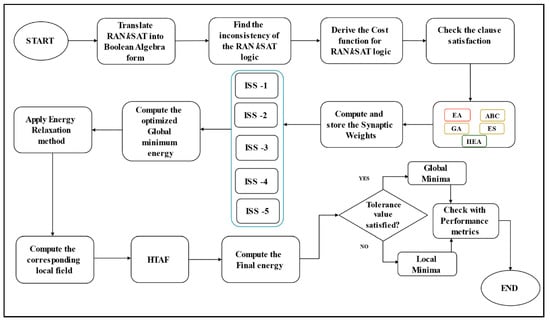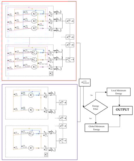The schematic diagram for DHNN-RANkSAT is shown in Figure 1 where the RANkSAT represents k = 3, 2. In this diagram, the red line represents the third-order clauses, and the purple line denotes the second-order clauses, respectively. Within each main block, the pink, orange and blue colored lines illustrate the connection of each neuron. The energy filter represents whether it aligns with the tolerance value or not. The output of the diagram depicts that either it can achieve the global minimum or a local minimum energy.