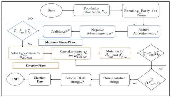 In terms of optimization, HEA introduced another efficient optimizer that can improve the local solutions. Following this, the characteristics of RANkSAT can rely heavily on the HEA because of its effective and robust mechanism. The HEA is utilized in this paper to find the best RANkSAT assignment that minimizes the cost function during the training phase of DHNN. The model is elucidated with detailed information in the next section. The procedure of the Hybrid Election Algorithm in DHNN-RANkSAT is explained in Section 5.1, Section 5.2, Section 5.3, Section 5.4 and Section 5.5
