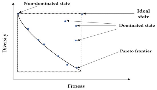 | Multi-objective functions that contain maximum fitness value with diversity ratio and ideal strings. | |
