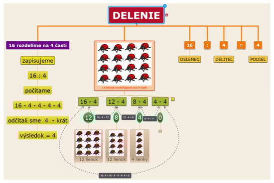 Concept map-drawing principle of division. Legend: Delenie-Division; 16 rozdelíme na 4 časti-we break into 4 parts; zapisujeme-we take in writing; počítame–we calculate; odčítali sme 4 – krát-we subtracted 4 times; výsledok-result; delenec-divident; deliteľ-divisor; podiel-quotient; 16 lienok rozdeľujeme na 4 časti-we separate 16 ladybirds into 4 parts (groups); 12 lienok-12 ladybirds; 4 lienky-4 ladybirds.